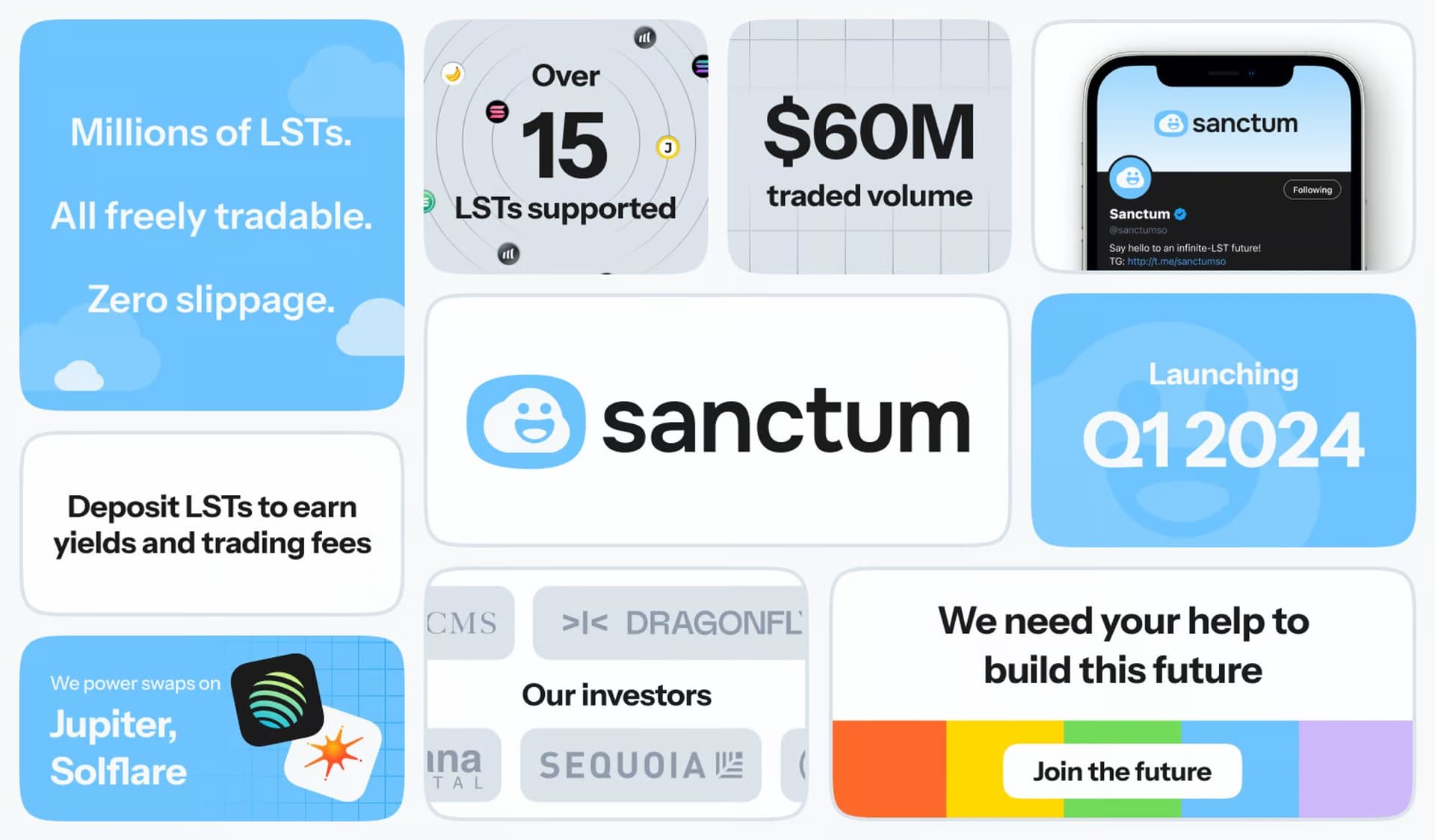 Sanctumは、Solana上で設計されたプロトコルで、リキッド・ステーキングを促進し、Solanaを無限のリキッド・ステークトークン(LST)時代に導入することを目的としています。 SanctumはネイティブでSOLをステーキングするユーザーやLSTを使ってステーキングするユーザーのための統一された流動性レイヤーを提供し、InfinityマルチLST流動性プールを通じて多岐にわたるホワイトリストされたLSTにアクセスする強力な機能を提供しています。